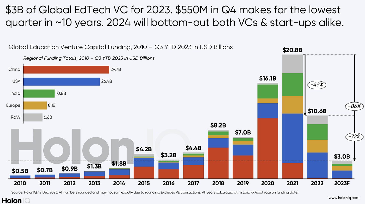Since that bumper 2021, investment into EdTech companies has plummeted and I strongly expect we are now past the peak.