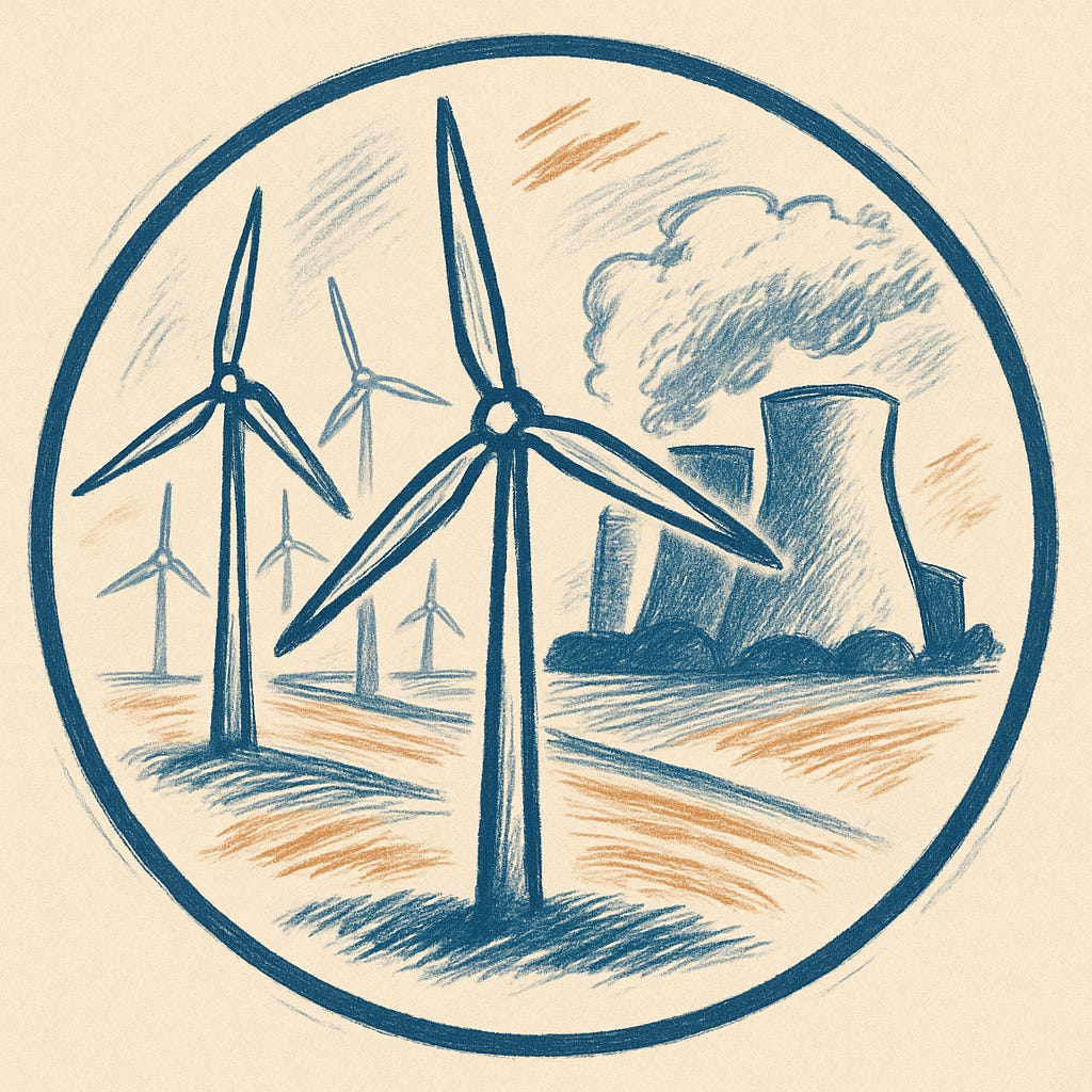 Energy creation relies on spinning turbines and, as of today, we do that in two ways. Firstly, we burn a pile of shit to create steam that spins the turbine. Secondly, we build giant turbines in windy places so that the wind spins the turbine.